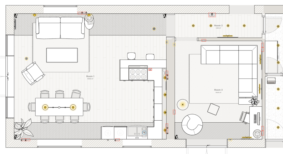 Living room decor plan with classic bay window, chiney breast and cornice with high skirtings.