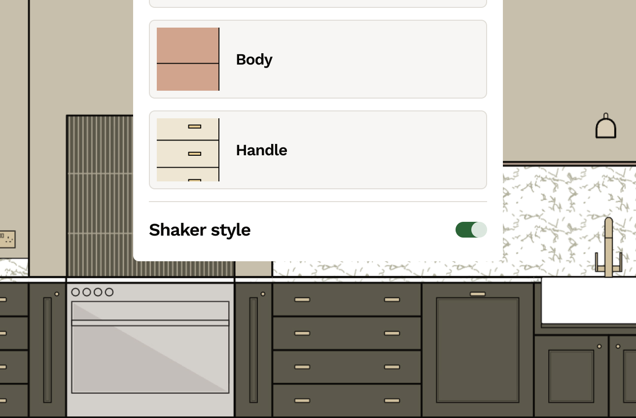 For kitchen furniture, toggle on and off a shaker frame to bring your elevations closer to your kitchen design.